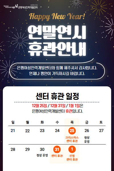 다중 게시판 공지사항 자료실 공지사항 12월 버크만진단 무료검사 이벤트 (동영상 퀴즈) [마감] 12월 취업준비교실 일정 안내 [마감] 취업자 네트워킹, 경력개발 노하우 공유! "취업자간담회" [마감] 스마트폰을 활용한 챗 GPT와 생성형AI 활용방법 <입문> [마감] 서울 서부권역 새일센터 연합 일자리 매칭데이(사무직종) 현장 면접 참여자 모집 공지사항 더보기더보기 자료실 ★★★2025년 [과정평가형]직업상담사 2급 자격증 과정 참가신청서 ★접수중★[2025 여성가족부] 한국어교원 양성과정 참가신청서 [2025 서울시] 늘봄학교 전문인력 양성_참가신청서 [2025 은평구청] 주거환경관리 전문인력 양성_참가신청서 [2025 여성가족부] 한국세무사회와 함께하는 세무사무원 양성과정 참가신청서 자료실 더보기더보기